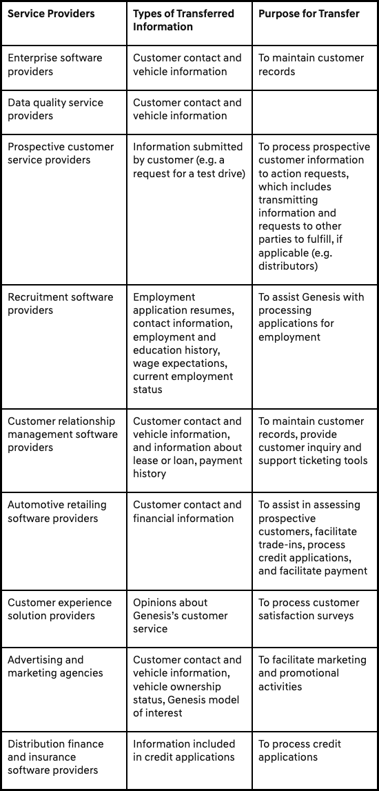 Genesis may share your personal information with its distributors, affiliates and service providers for the purposes set out herein. For example, we may share your personal information with our service providers exclusively for the purpose of providing services for us (e.g., to fulfill your request to enter into a Genesis contest).